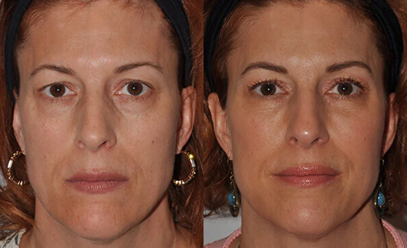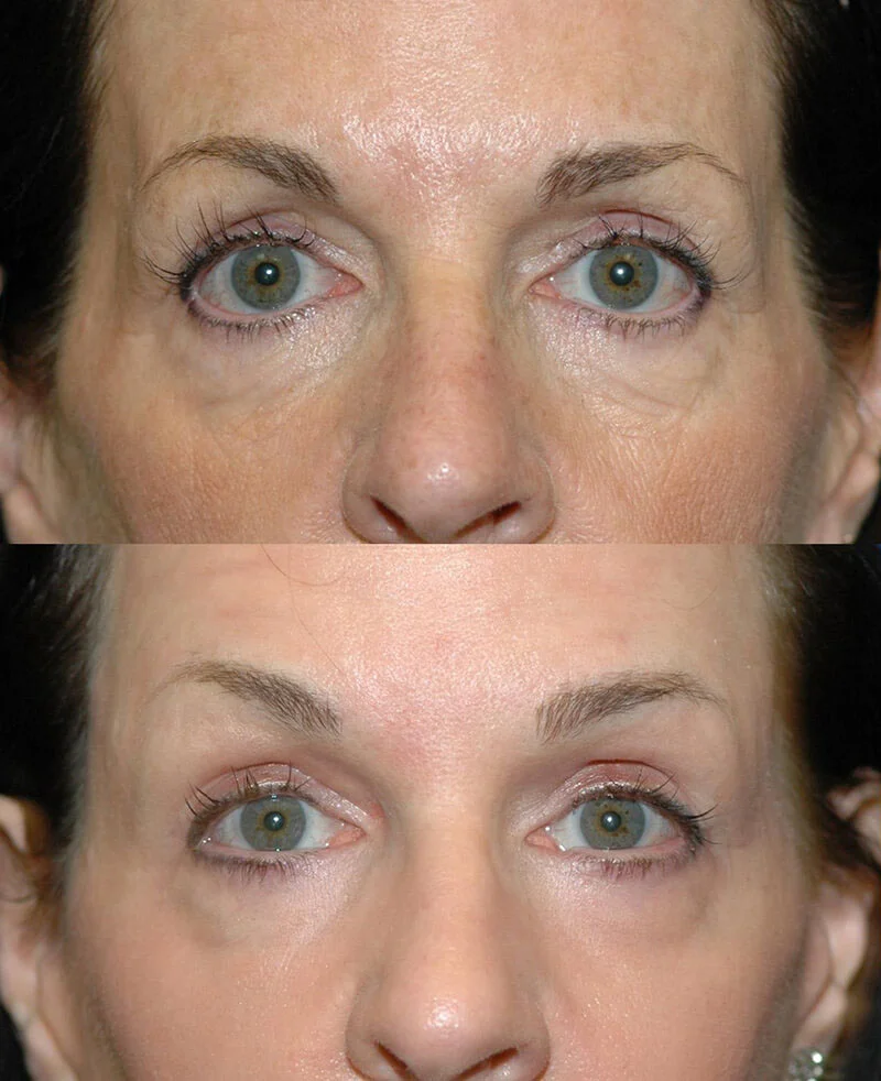 Furthermore, pigment (color) changes with dark and discolored spots emerging on the skin, a process accelerated by sun exposure and hereditary factors. Skin texture and pigment changes can be counteracted by resurfacing techniques such as chemical peels, laser treatments, and dermabrasion. Below is an example of a woman who underwent resurfacing to smooth the texture of her skin around her eyes:
